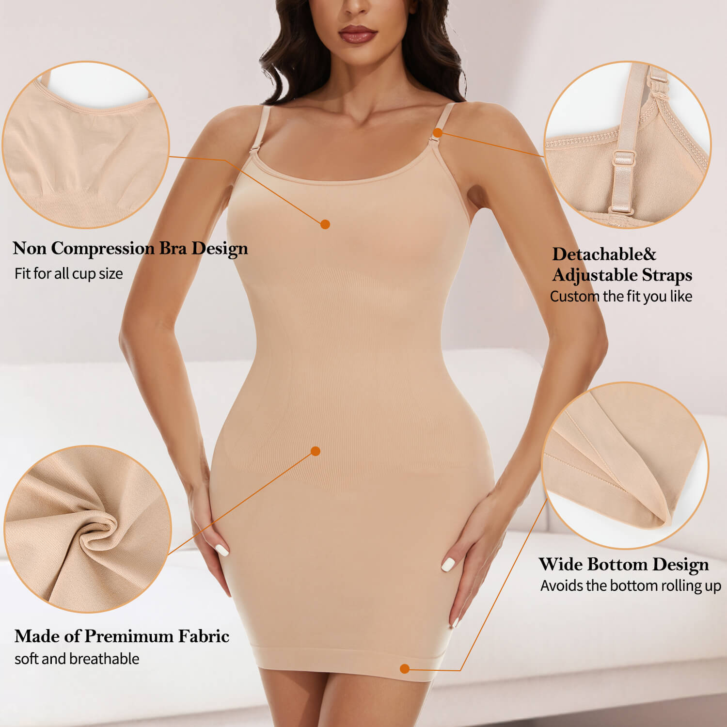 Detachable Adjustable Straps: Our women's body slim shapewear slips come with detachable straps, providing versatility and convenience. The control level of our slips is rated as LIGHT, offering 360 degrees of tummy control. This seamless spaghetti strap slip helps tighten your waist and reduce muffin tops, promoting a slimmer figure. Feel confident all day with the perfect amount of compression.