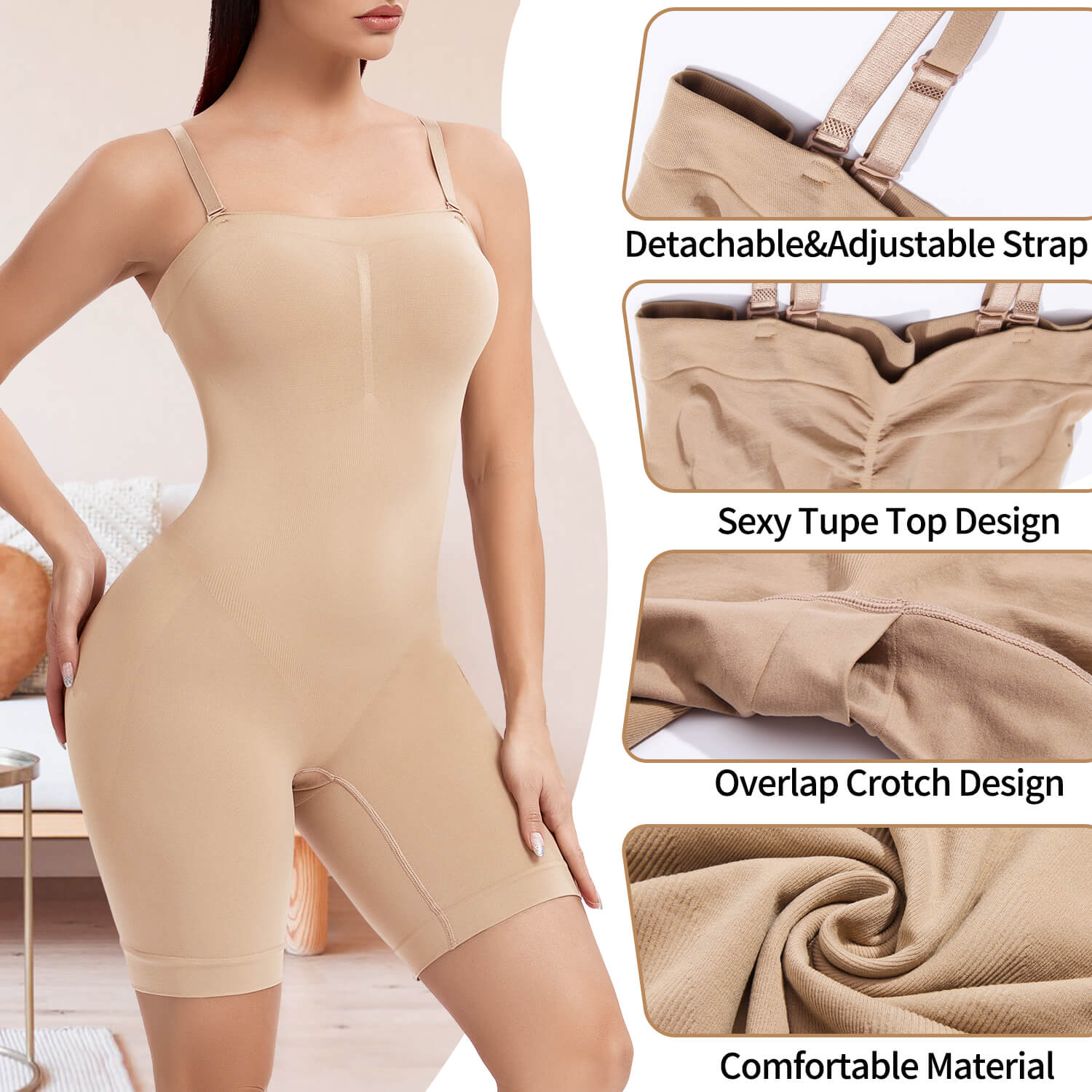 Compression Level: Medium to Strong. This strapless bodysuit is perfect for cinching your waist, holding in your tummy and core, and smoothing your thighs under mini skirts and dresses.